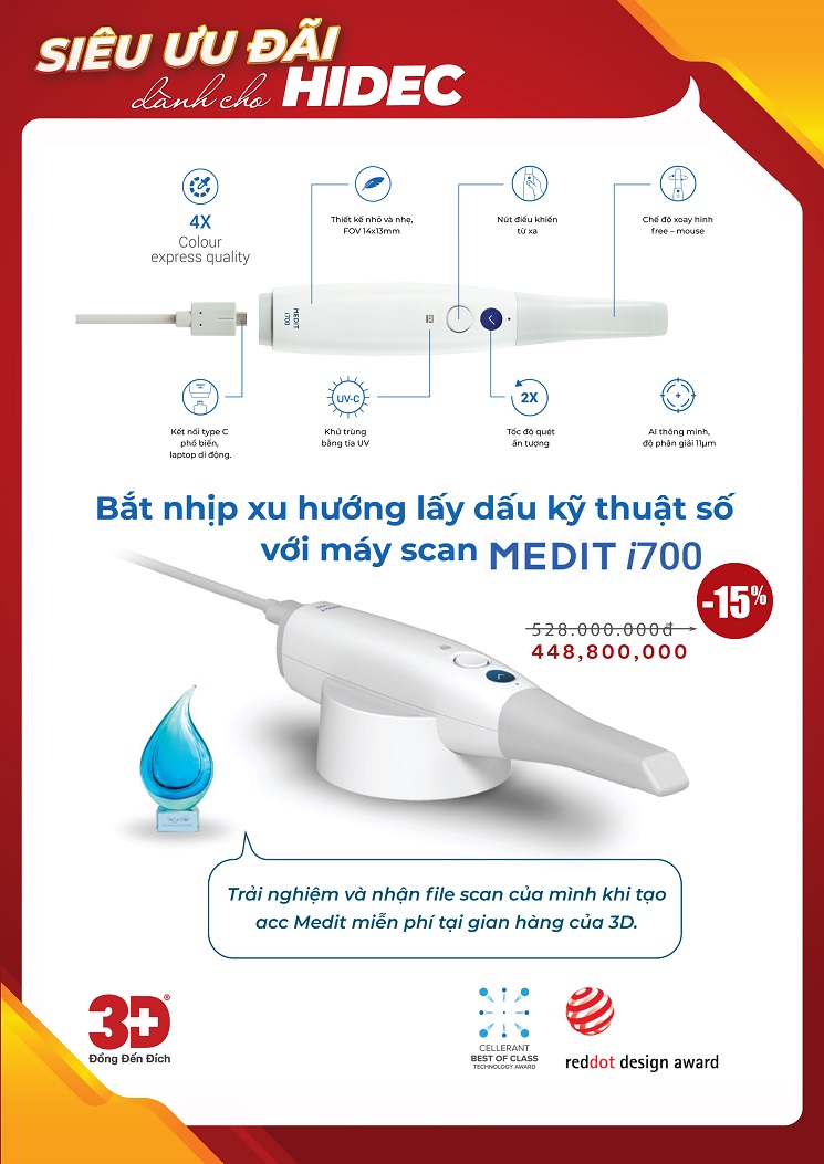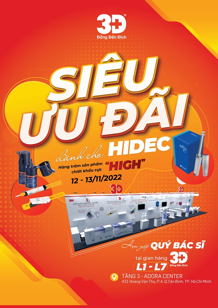 Công ty 3D là một trong những đơn vị tham gia chương trình Hội nghị HIDEC 2022 với loạt chương trình khuyến mại cuối năm. Rất nhiều sản phẩm với giá ưu đãi chưa từng có đến từ các công ty hàng đầu thế giới: 3M, MIS, Dentsply Sirona, Letus,…