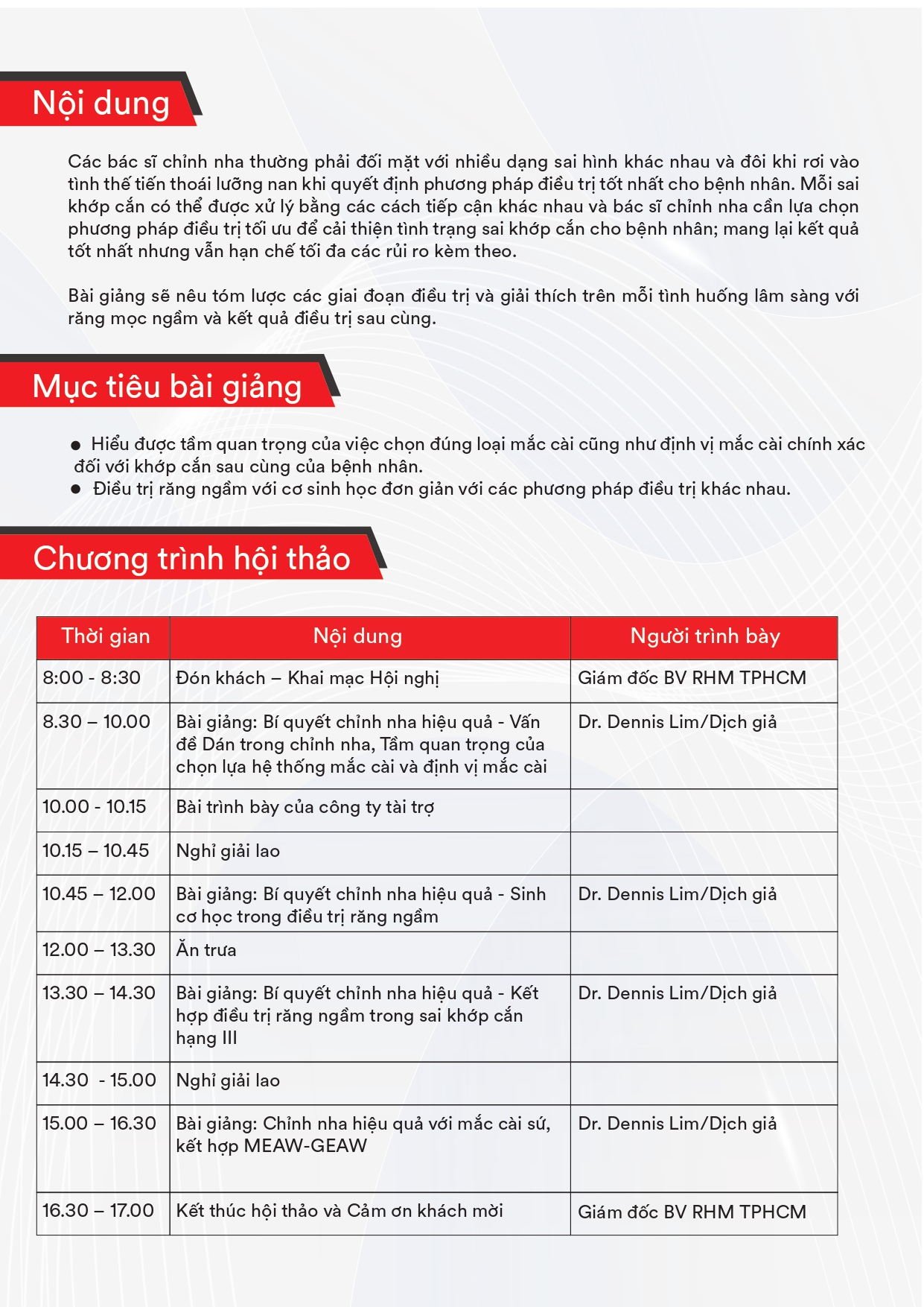 | 13g30-14g30 | Thảo luận về Bí quyết chỉnh nha hiệu quả – Kết hợp điều trị răng ngầm trong sai khớp cắn hạng III | Dr. Dennis Lim/ Dịch giả |